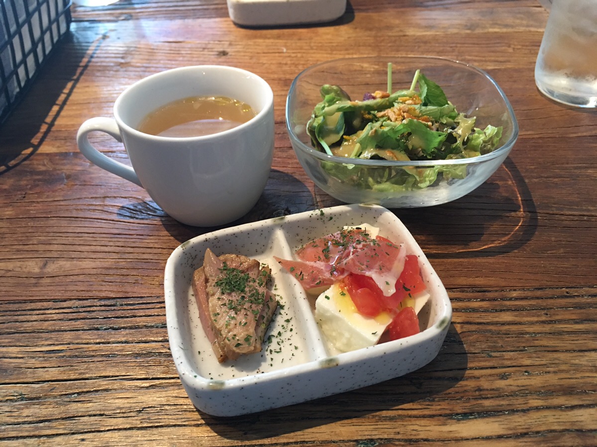 ランチも前菜のサラダスープ、小鉢がついて千円前後で