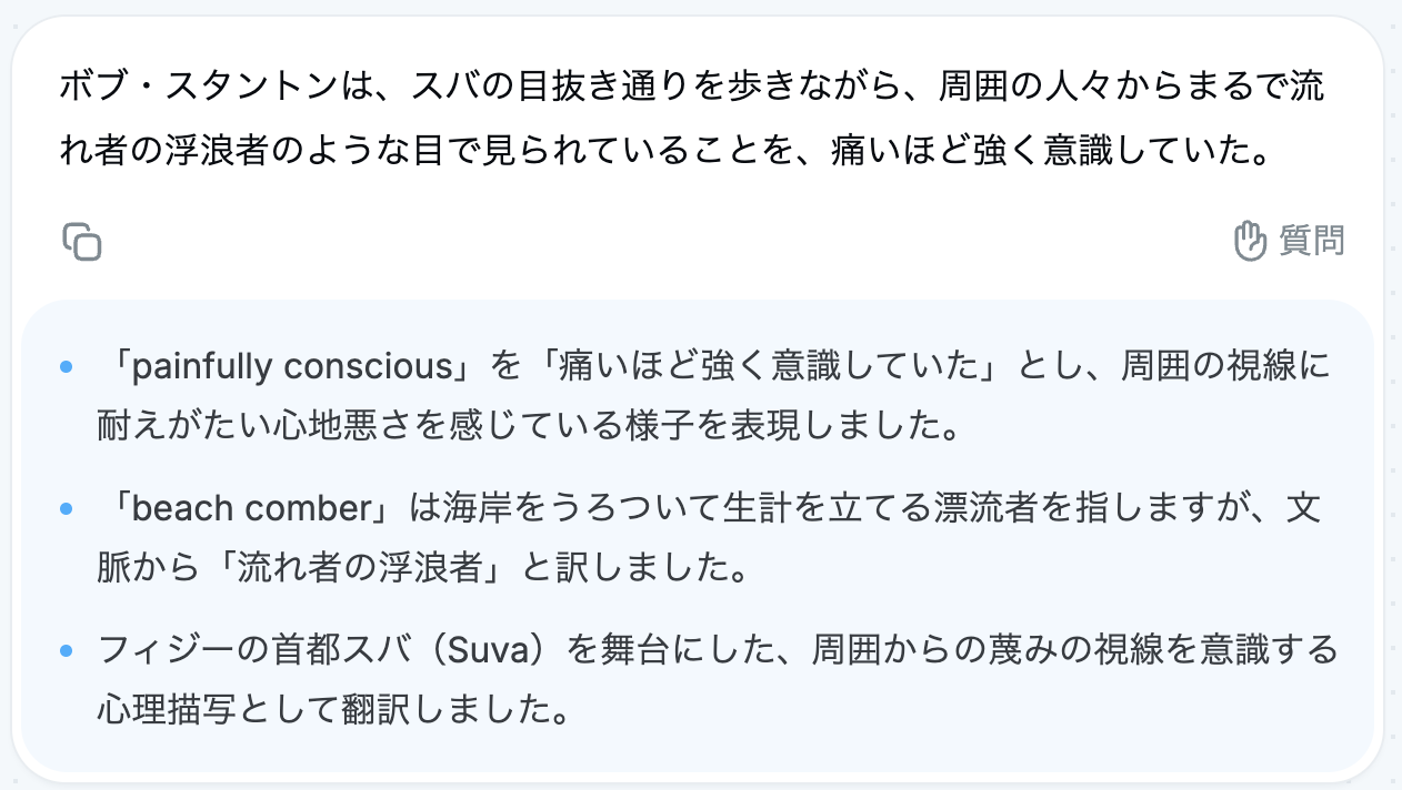 さらに、”まるでネイティブに相談しているかのように翻訳できる”という開発理念のとおり、翻訳した内容に対してさらに質問したり、シーンやニュアンス別の表現などを教えてもらうこともできます。
