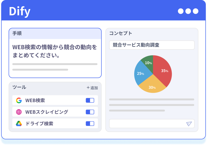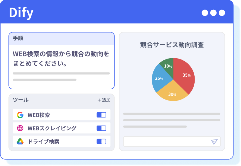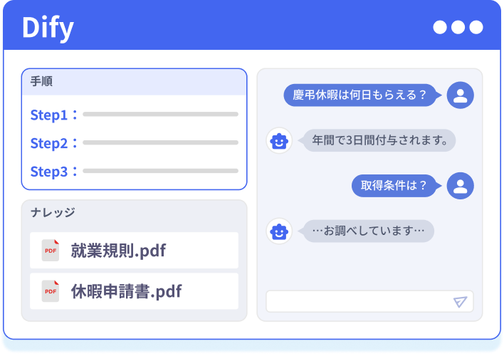 “Dify”を活用し、お客様のAI導入を「企画」から「開発」、「効果検証」「運用」までワンストップで伴走支援するAIエージェント導入サービスです。 “Dify”を活用し、お客様のAI導入を「企画」から「開発」、「効果検証」「運用」までワンストップで伴走支援するAIエージェント導入サービスです。